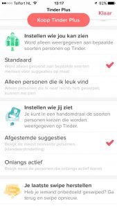 Een andere leuke extra is dat je met Tinder Plus kunt instellen om delen van je profiel onzichtbaar te maken, zoals je leeftijd of afstand. Als laatste pluspunt kun je instellen wie jou kan zien en wie jij ziet. Wil je bijvoorbeeld alleen gezien worden door personen die je naar rechts hebt geswiped of wil je alleen personen bekijken die onlangs actief waren? Dan kun je dit veranderen bij je instellingen. Tot slot wordt je op Tinder Plus niet gestoord door irritante advertenties en kun je dus ongehinderd swipen.